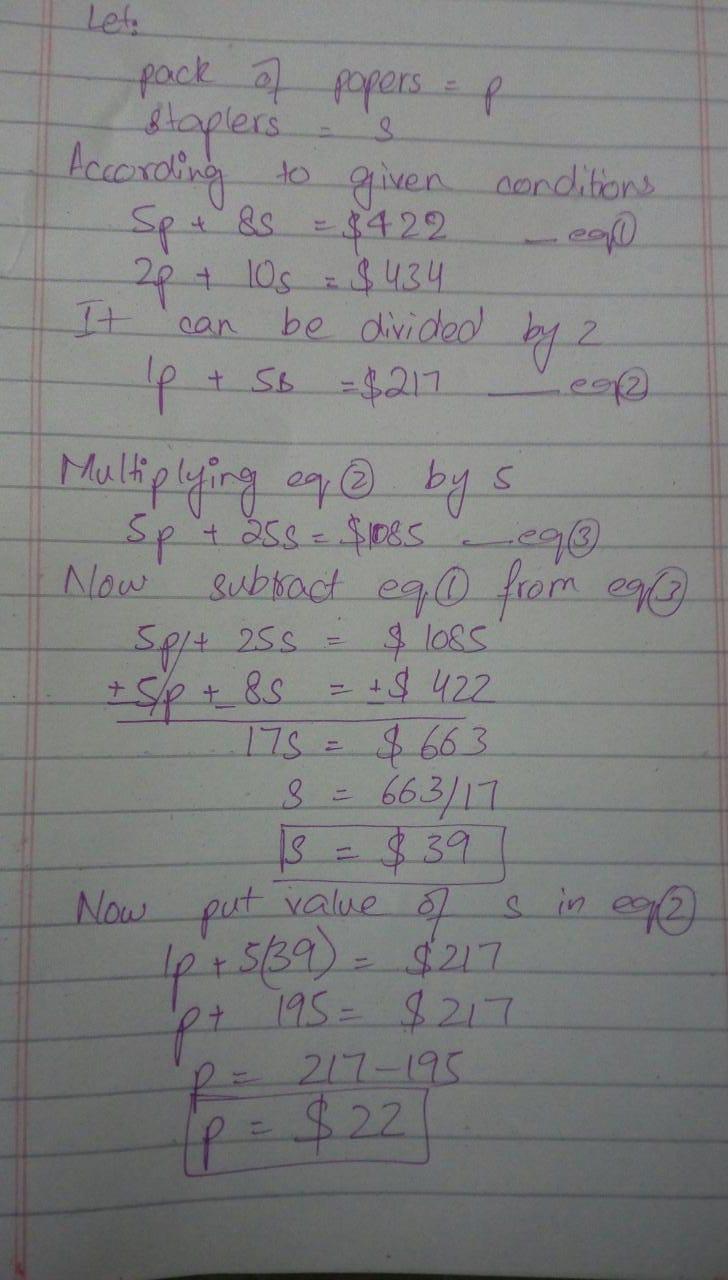 Levi is buying office supplies. He can buy 5 packs of paper &amp; 8 staplers for $422 or he can buy 2 packs of paper and 10 stap
