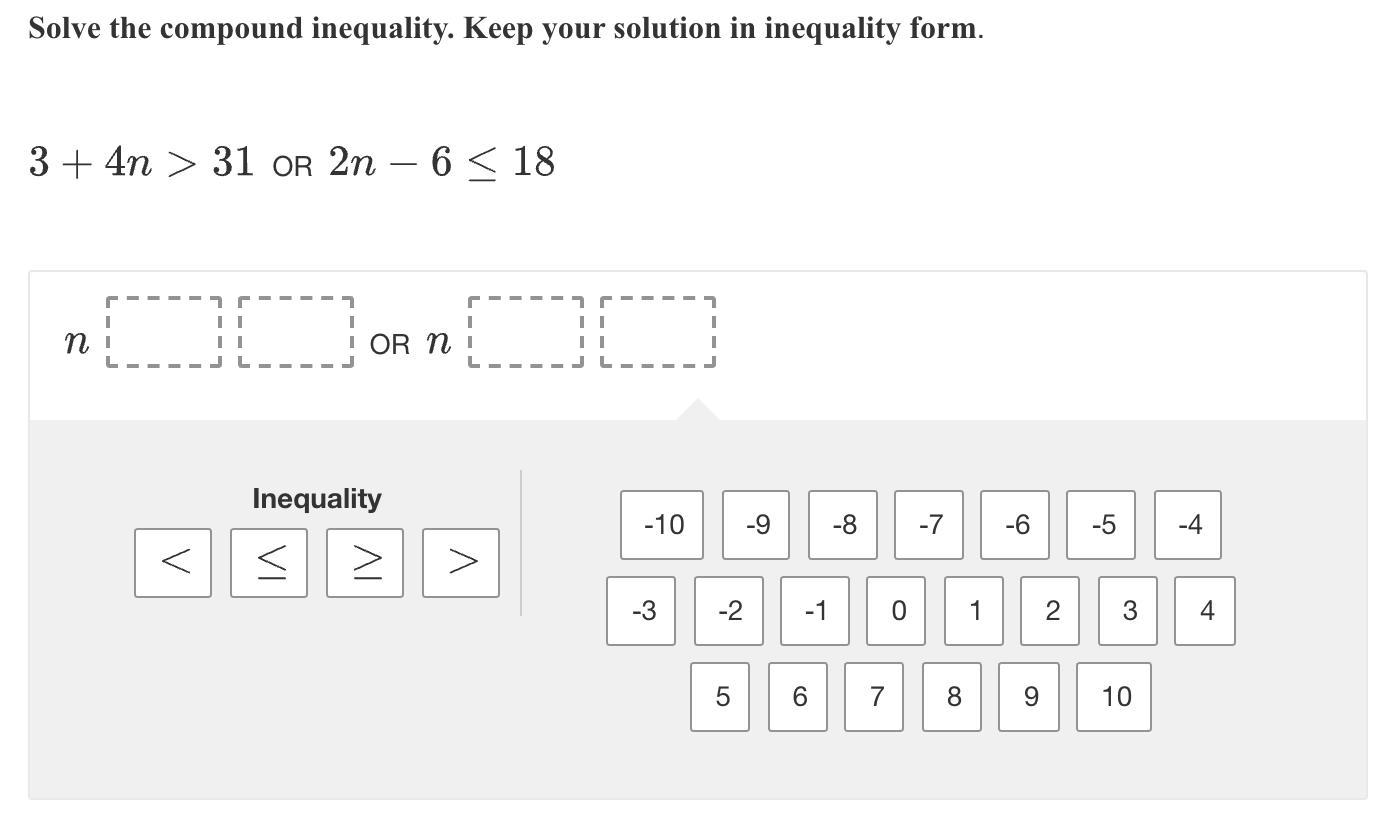 the other problem you would do the same thing so 2n-6=18 the first step you would do is add 6 to both sides, 2n=12 then divide both sides by 2 n= 6 then change back the sign n<6 (less than or equal to) make sure to add the dash under the last problem i just couldn’t add it to this on my phone.