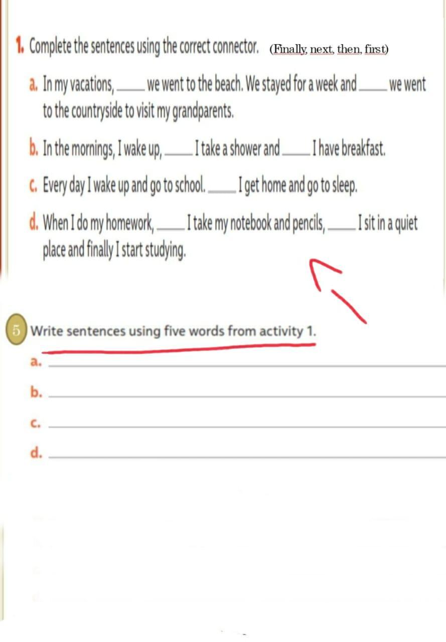 1d. When I do my homework, first I take my notebook and pencils, then I sit in a quiet place and finally I start studying.