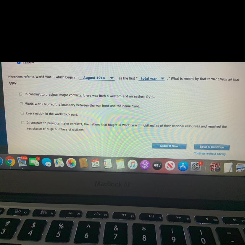 It should be the second & fourth choice. the term "total war" means that countries mobilized all their national resources in order to commit to the war effort: everyone was involved. this meant that all factories were producing war materials and the government was planning production quotas and food rationing for normal civilians at home. total war required a unified effort.