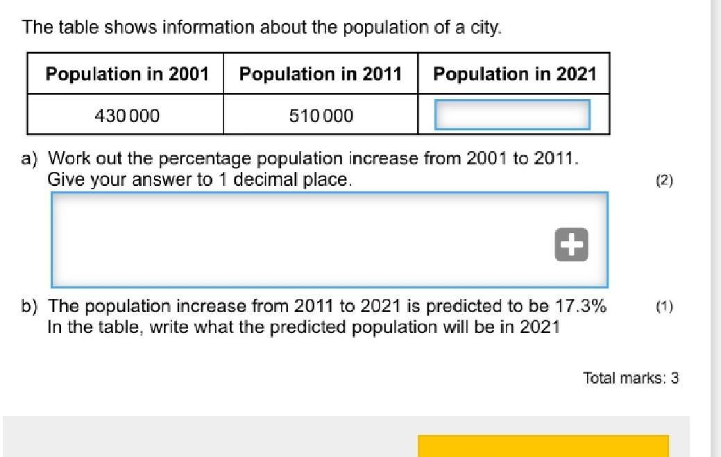 a) In the first part of the question, you are given two population values and asked to find the percentage difference between them. A formula you can use for that is ...