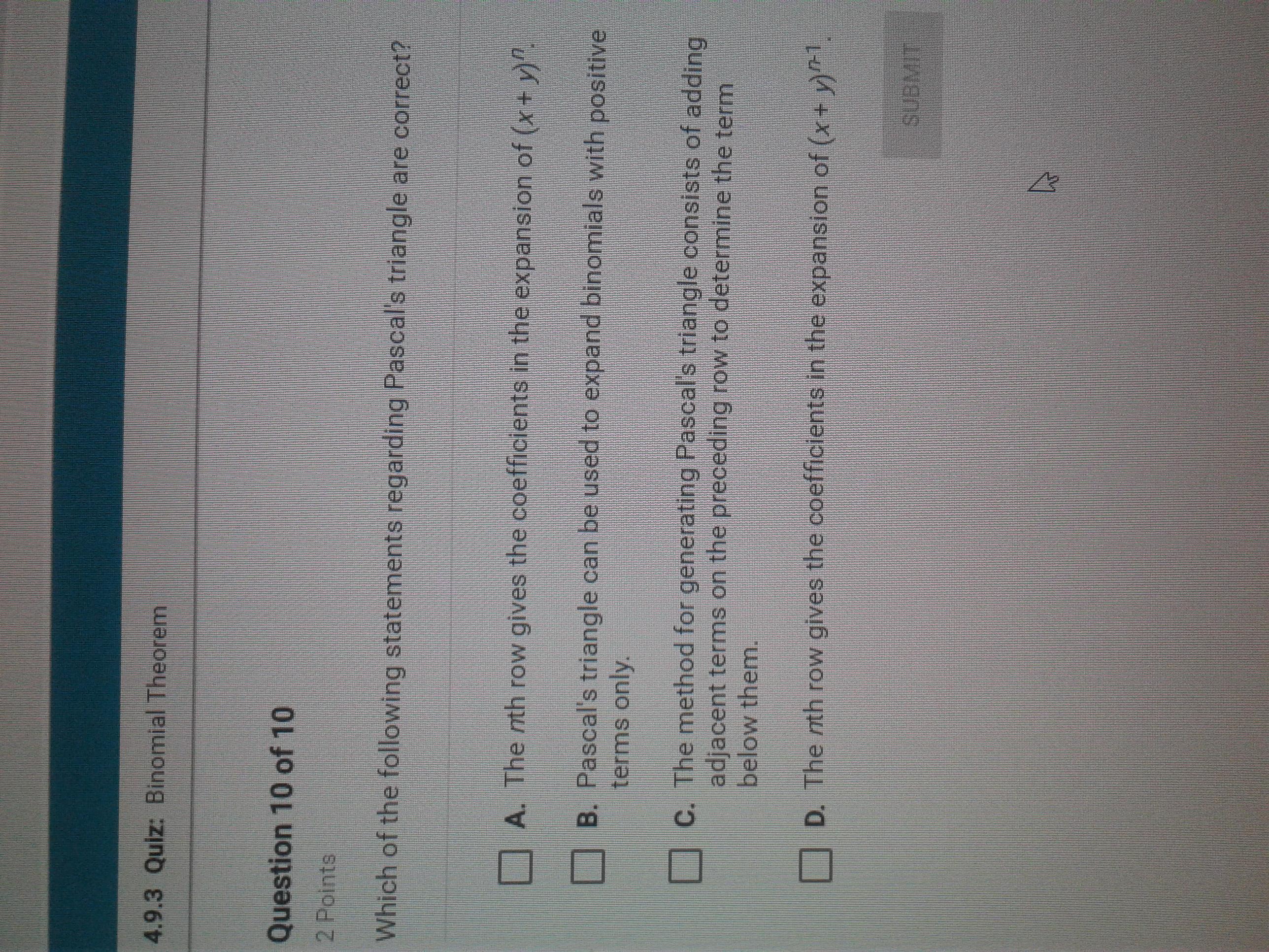 C) The method for generating Pascal's triangle consist of adding adjacent terms on the preceding row to determine the term below them.