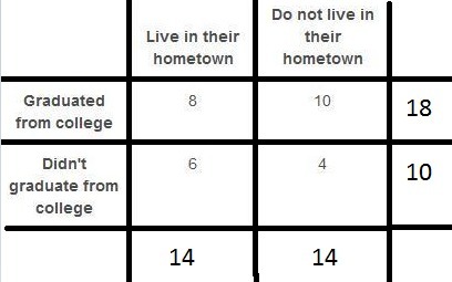 Thus , Among people who do not live in their hometown the relative frequency of not graduating from college = 0.28
