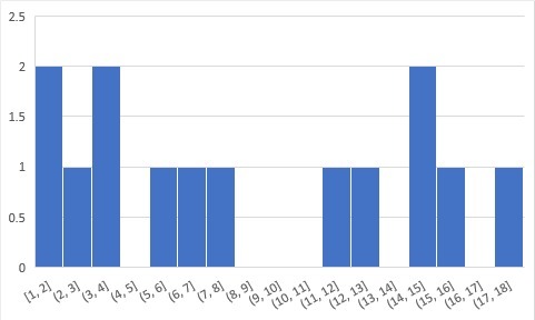 See the attached picture for the histogram. To accomplish this manually, we would have to find the minimum and maximum (1 to 18), decide on the bin size (I used 1 here), and list the frequency of each result. In this case: