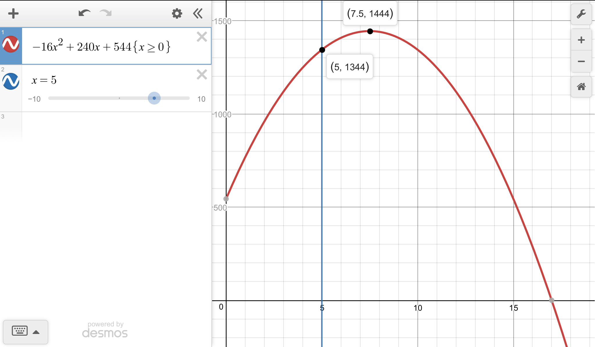 Analytically, the vertex is found at t=-b/(2a) = -240/(2·(-16)) = 240/32 = 7.5 . . . seconds. h(7.5) = (-16·7.5 +240)·7.5 +544 = 1444 . . . ft.