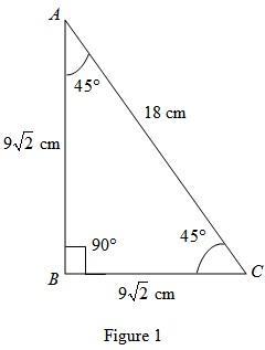 Keywords: Triangle, perpendicular, base, hypotenuse, cos, sin, cos45, sin45, right angles triangle, figure, length, 45-45-90, 18cm, 9square root 2.