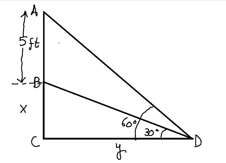 The height of flag staff is represented by segment AB, BC is the height of pedestal stand , D is a point on the ground that makes angles 30° and 60° with the bottom and top of staff at B and A respectively.