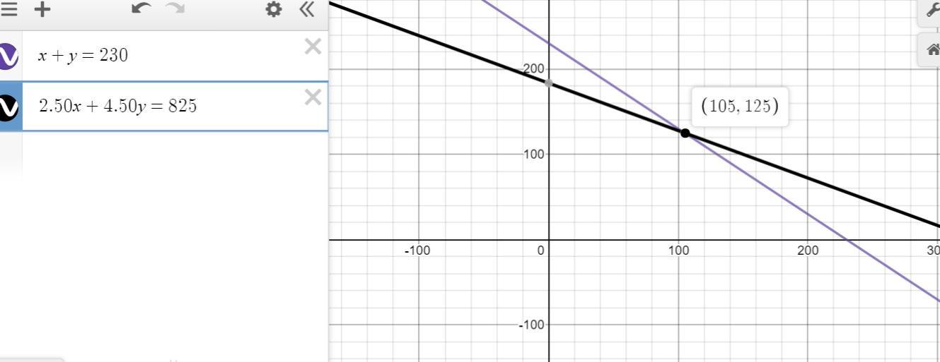 The solution is the point (105,125)