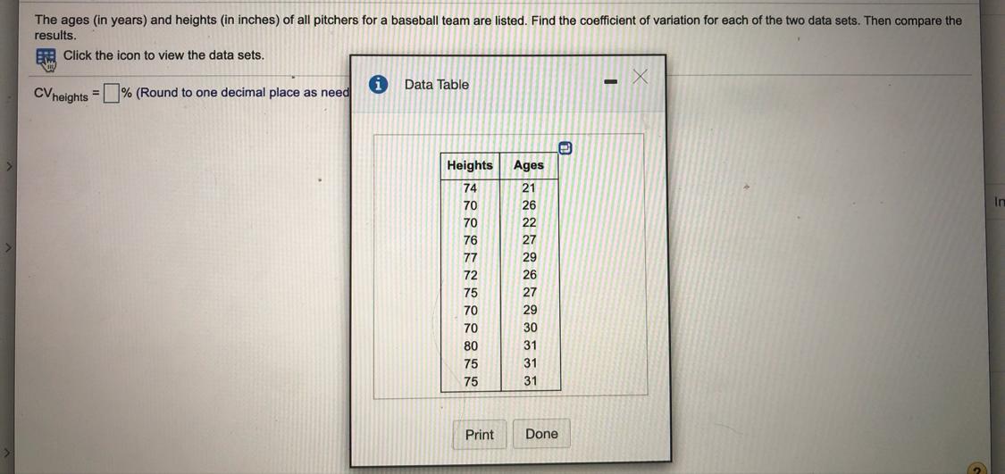 The ages (in years) and heights (in Inches) of all pitchers for a baseball team are listed. Find the coefficient of variation fo
