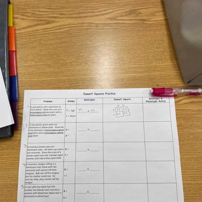 1.) TT x Tt; Genotype: TT 2: Tt 2; Phenotype: 100% Tall