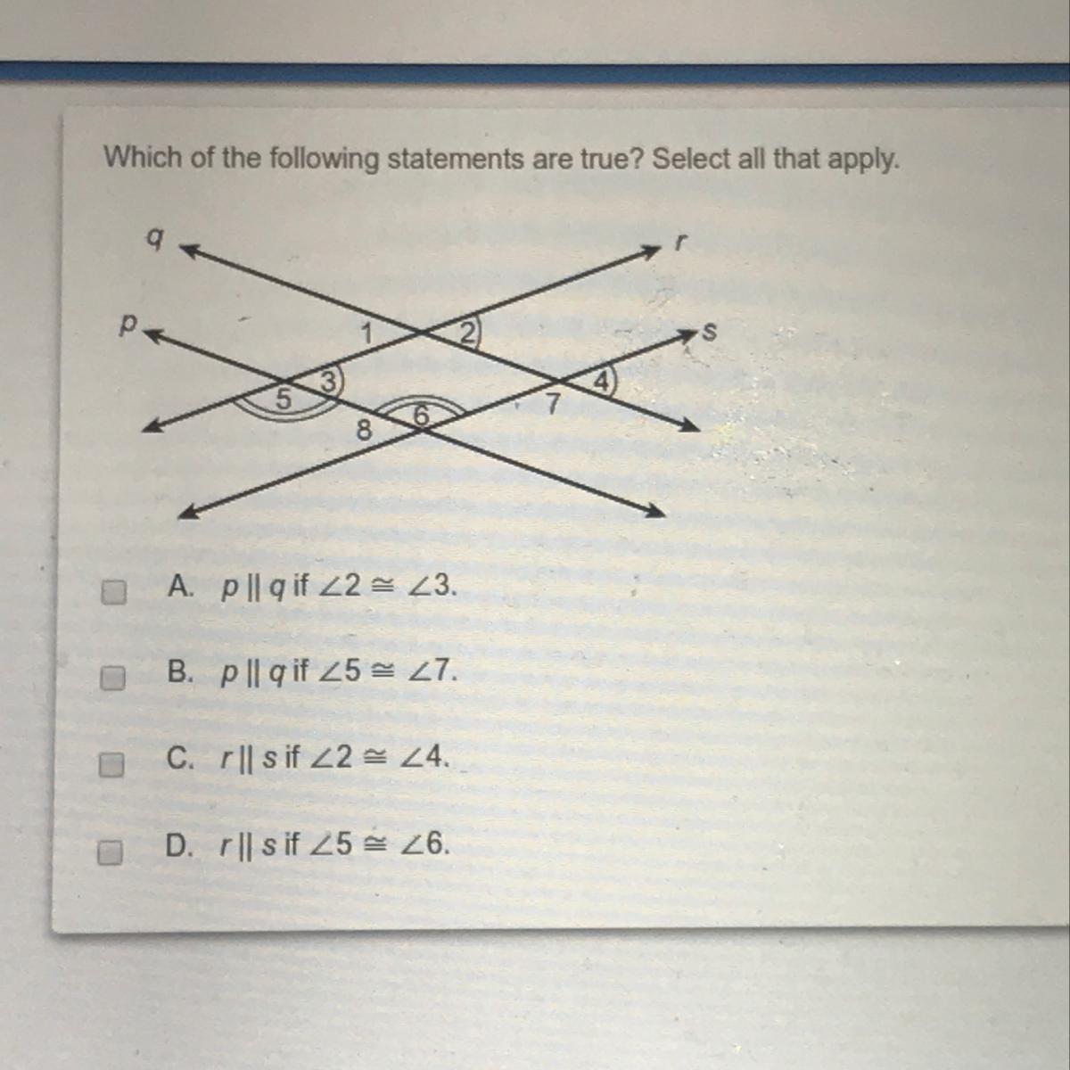 Angles 5 and 7 have no common side, so their congruence does not guarantee anything about the lines that create them. Choice B is not applicable.