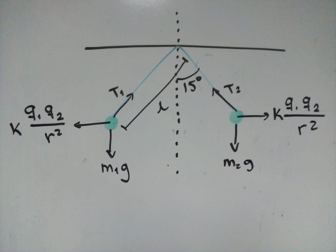 q^2 = tan(15) r^2 mg / k = 4.987 x 10^-14 C^2