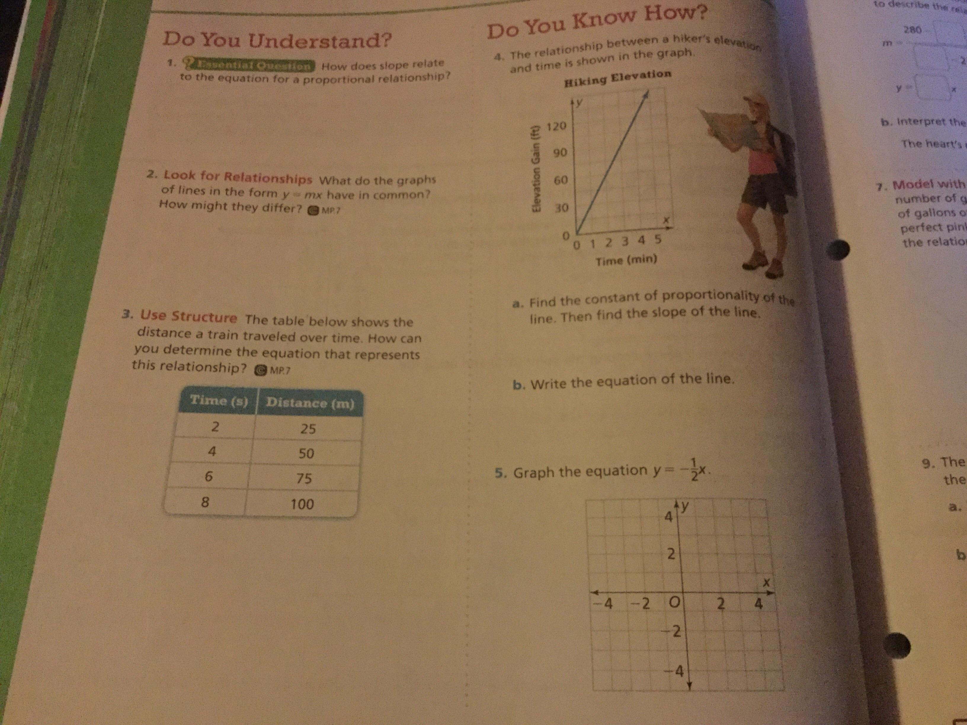 In this case, we have a relationship between a hiker's elevation and time given by a proportional relationship. We know this is so because the graph is a line and passes through the origin (See Part 2). So we can find the constant of proportionality by computing the slope of the line. Therefore: