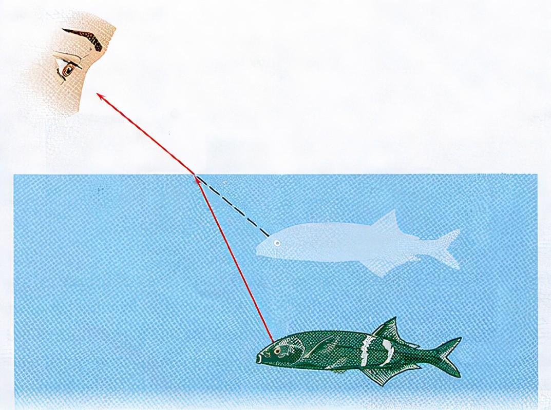 Answer: Because the hunter will try to aim at the fish, but the image of fish he sees is actually the apparent image of the fish at a location.