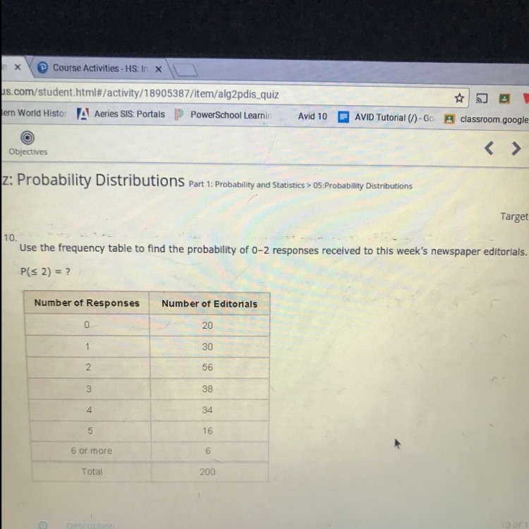 We see we could have just said 20+30+56=106 of the 200 editorials got zero, one or two responses, so the probability is 106/200.