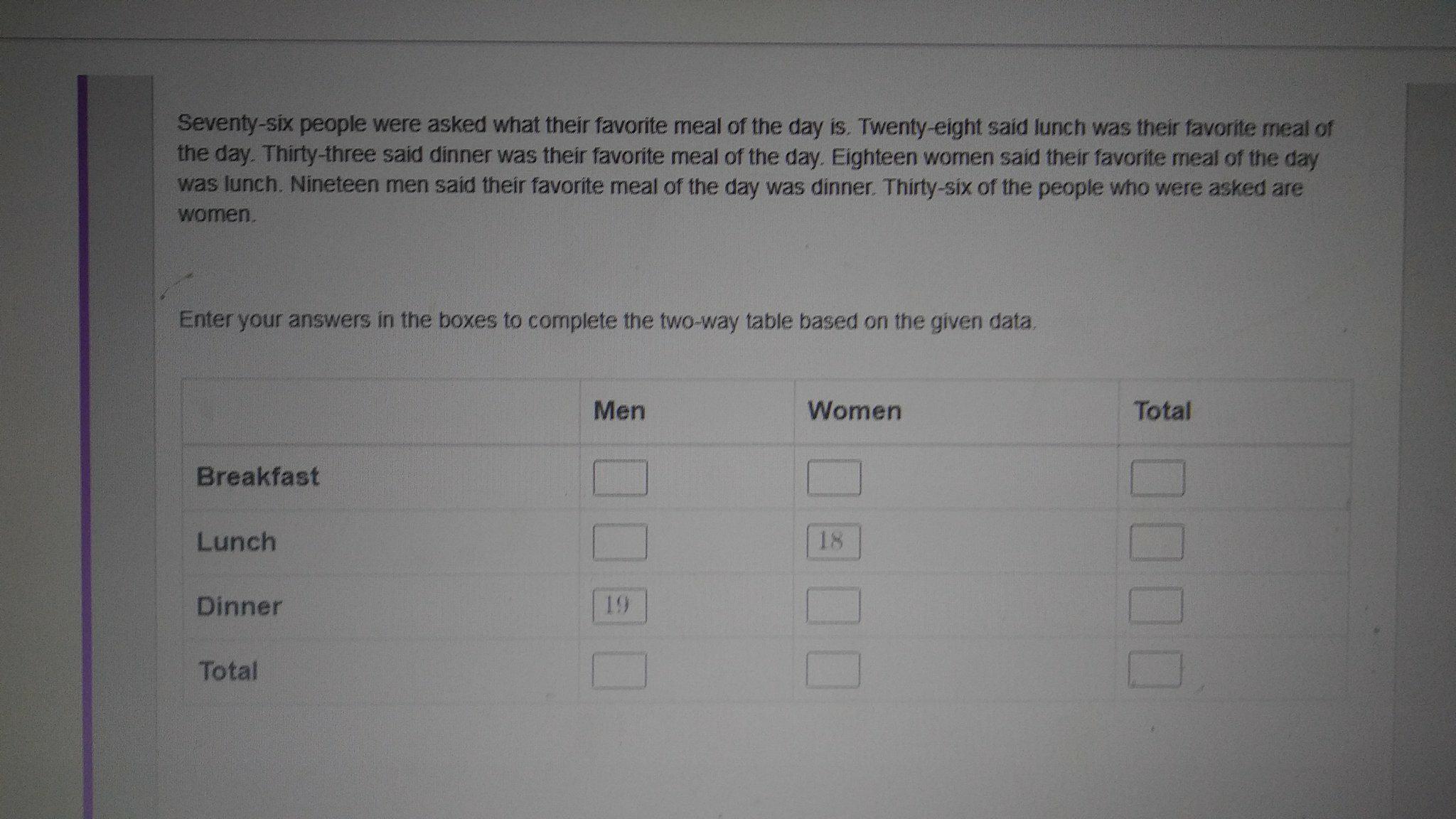 19 men said their favorite meal of the day was dinner.