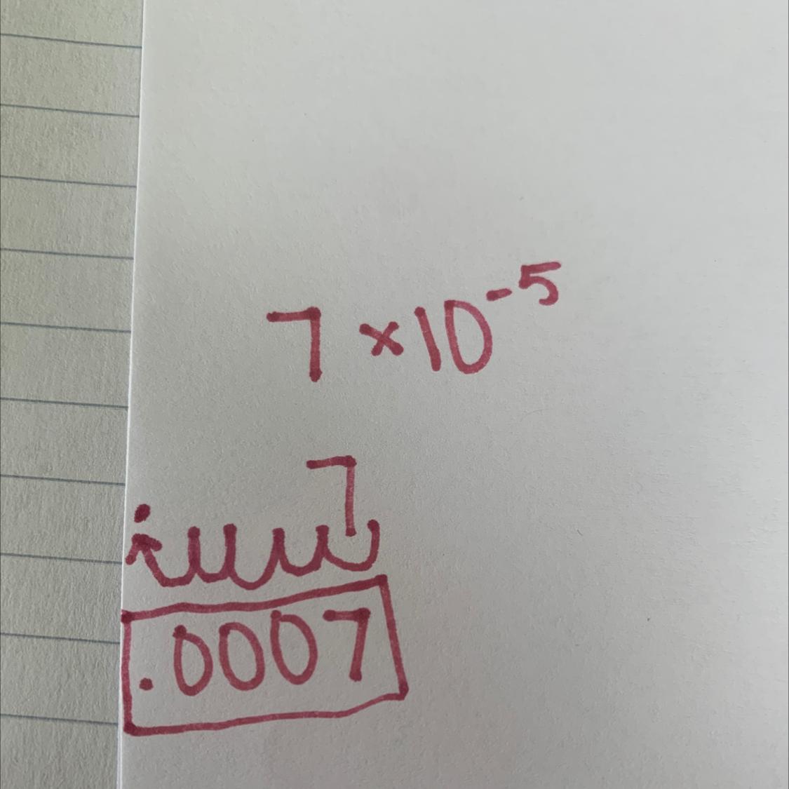 If it is to the negative power, you live the decimal point to the left (if positive, move to the right). In the case we move the decimal point 5 places to the left of 7. This results in .00007.