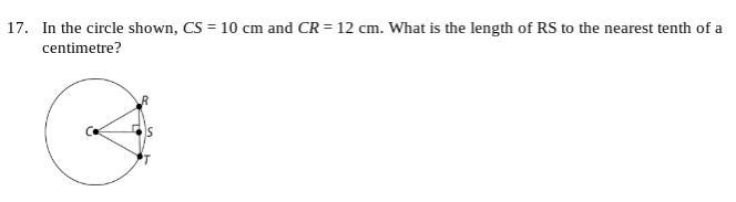 17. The segments within the circle form a right angle. Triangle CRS as a right triangle must follow the Pythagorean theorem which says the square of each leg adds to the square of the hypotenuse.