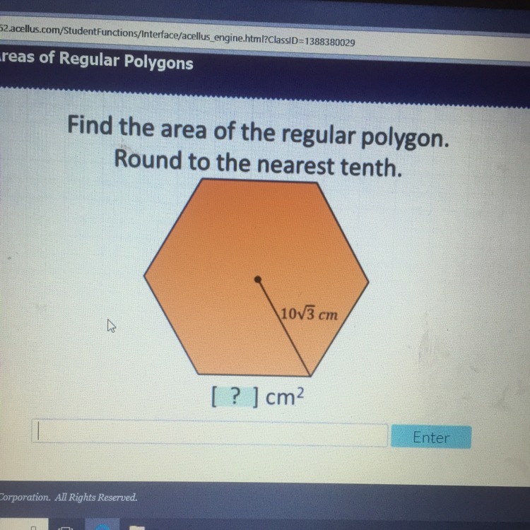 The area of a regular polygon is A = 1/2 ap, where a is the apothem and p is the perimeter. You have the radius. It's not much, but it's enough. That given radius there serves as the hypotenuse of a right triangle. Dropping the altitude from the center straight down is our apothem. That's like a leg of that right triangle. This is a regular hexagon. That means that each of the 6 central angles measures 60 degrees (360/6=60). With each radii measuring the same length, then each base angle measures the same as well by the isosceles triangle theorem. Those measure 180-60=120 together, so each one measures 60. Also, since this is an equiangular triangle, all the sides measure the same length as well. That means that one side of this polygon measures