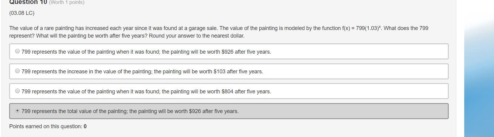 y the function f(x) = 799(1.03)x. What does the 799 represent? What will the painting be worth after 5 years? Round your answer to the nearest dollar. 799 represents the value of the painting when it was found; the painting will be worth $926 after 5 years 799 represents the increase in the value of the painting; the painting will be worth $103 after 5 years 799 represents the value of the painting when it was found; the painting will be worth $804 after 5 years 799 represents the total value of the painting; the painting will be worth $926 after 5 years