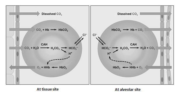 3. As bicarbonate ion: The carbon dioxide in RBC reacts with water and forms HCO₃⁻ & H⁺. The reaction is catalyzed by carbonic anhydrase.