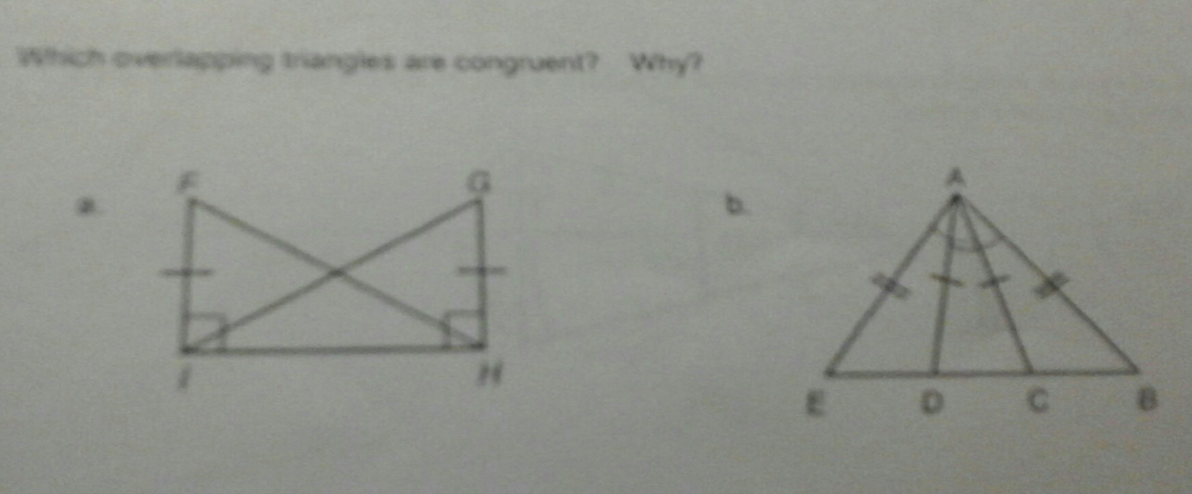 Triangle FHI is congruent to triangle GHI Side FE is congruent to side GH Angle FIH is congruent to angle GHI through the right angle theorem Side IH is congruent to side IH through overlapping triangles So the triangle is congruent through Side Angle Side (SAS)