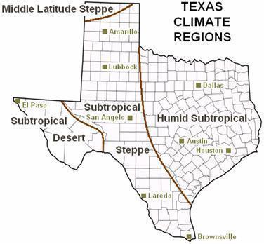 The subtropical region in Texas is located from about Amarillo to down the panhandle. This region has hot summers and winters.