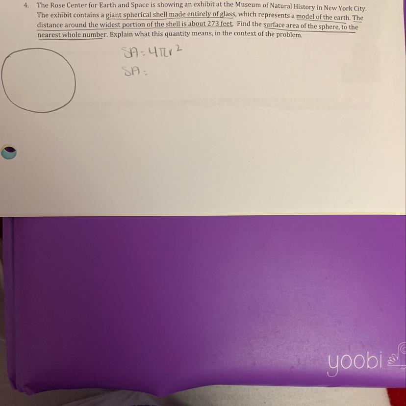 First find the radius of the sphere using the formula circumference= pi * diameter