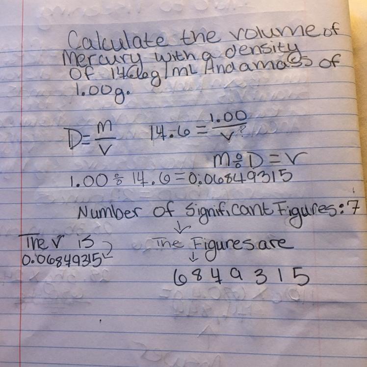 Calculate the volume of mercury with a density of 14.6 g/mL and a mass of 1.00 g. Please include a numeric value only with signi