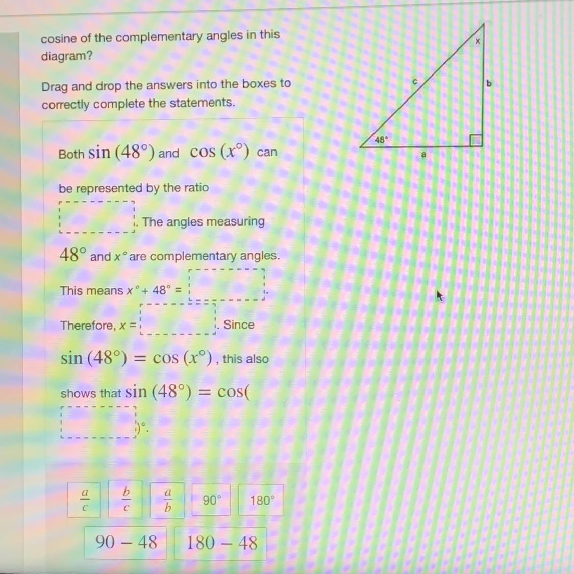 What is the relationship between the sine and cosine of the complementary angles in this diagram?