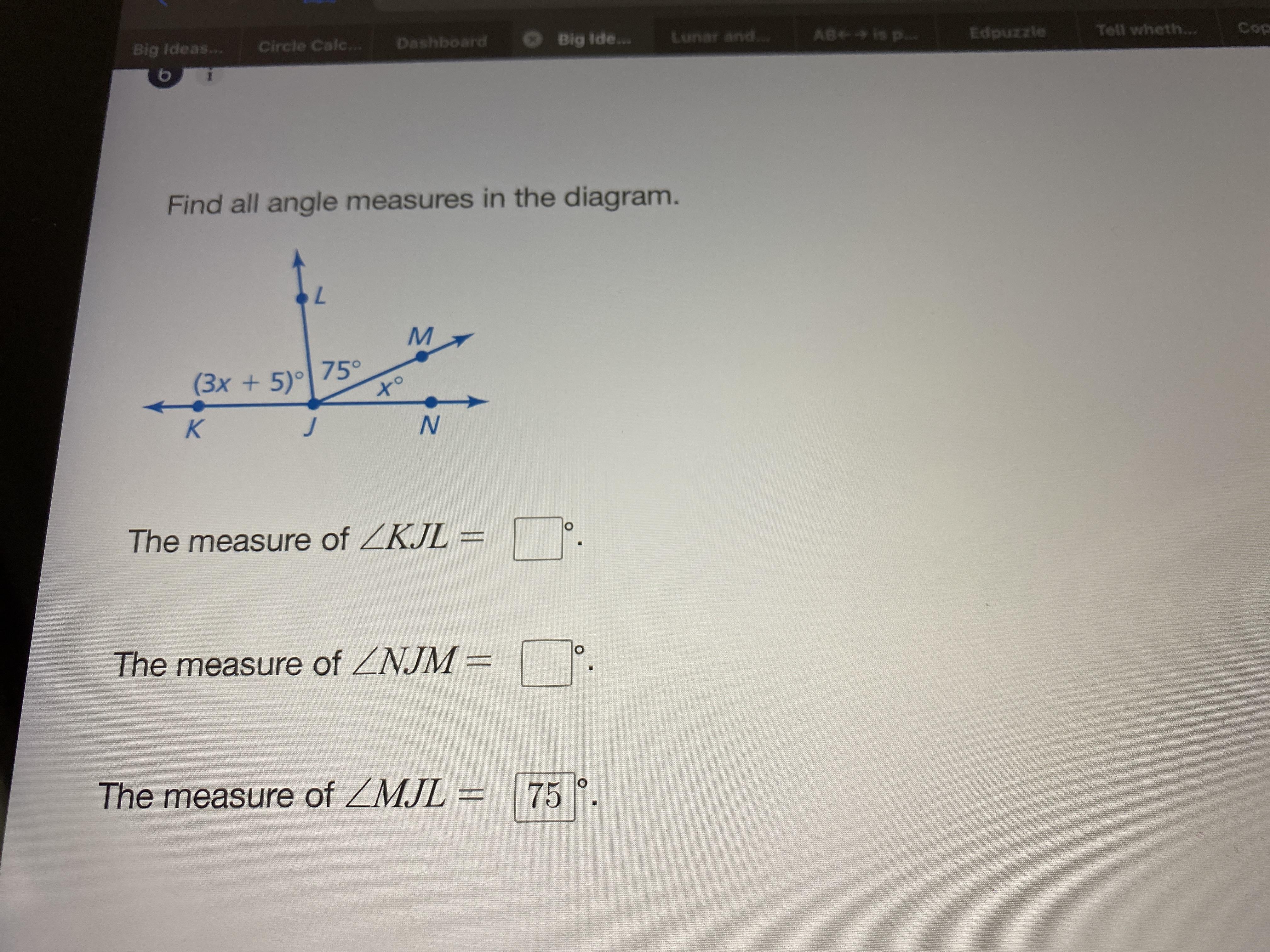 Angles 3x+5, 75 and x all together make up 180 degrees (review "straight angles").