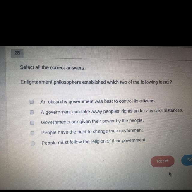 Explanation: The philosophers of the Enlightenment established that <u><em>governments are given their power by the people</em></u>. They also established that <u><em>people have the right to change their government.</em></u> The Enlightenment was an age of rationalism and empiricism. John Locke was one of the most important and most influential philosophers in politics.