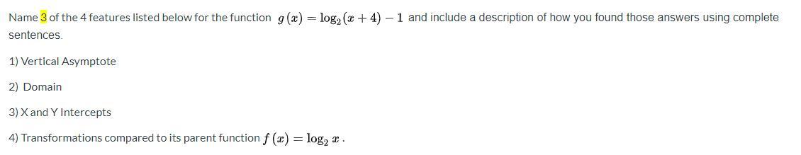 Name 3 of the 4 features listed below for the function g(x) = log2 (x+4) - 1 and include a description of how you found those an