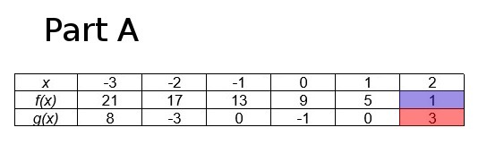 See the image labeled "part A". We'll use the values marked in blue and red for f(2) and g(2) respectively. These values are the function outputs when the input is x = 2.