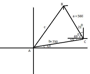 c=\sqrt{(560)^2+(730)^2-2\times560\times730\cos74}
