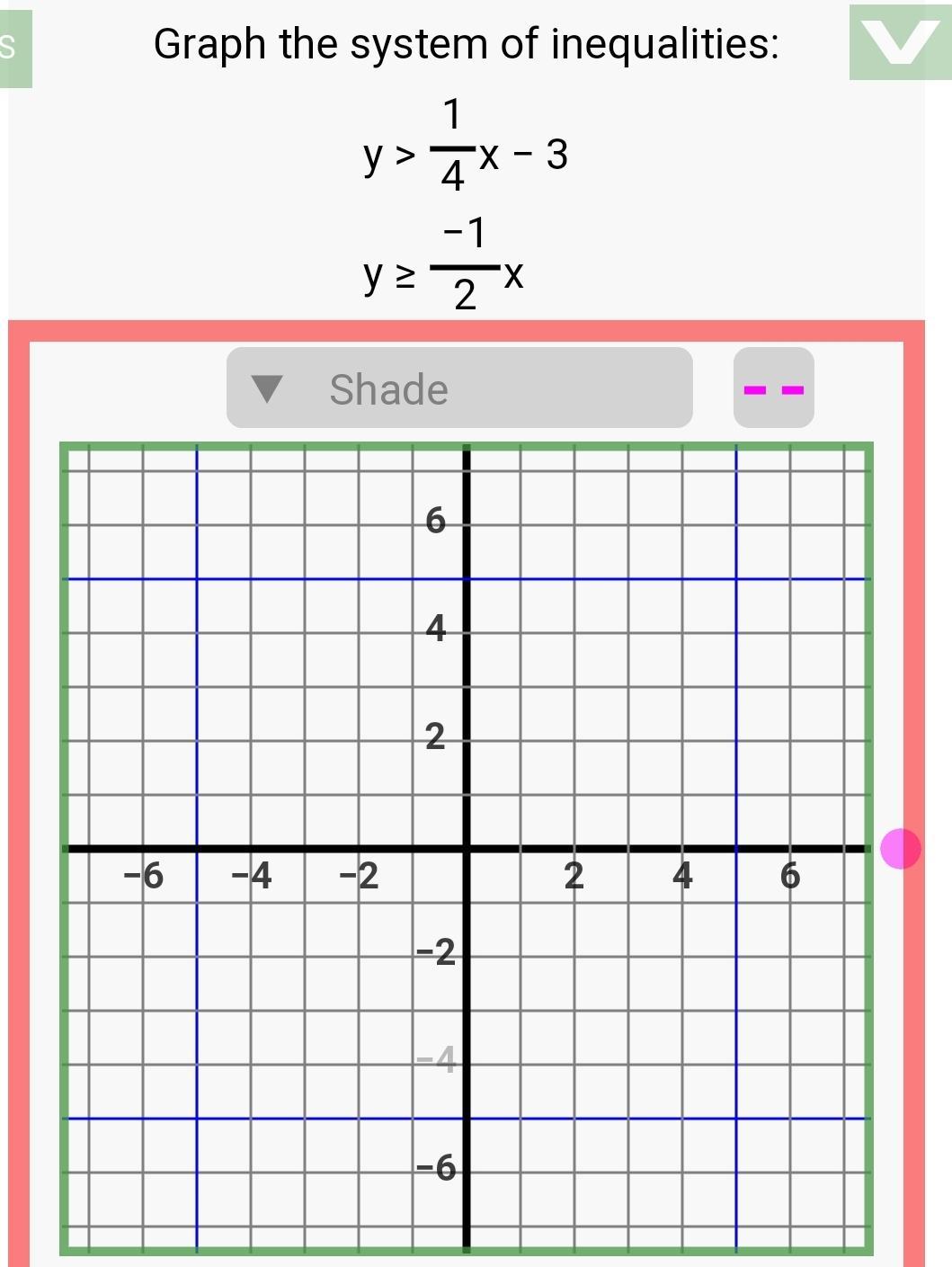 The y-intercept is 0. The ratio of rise to run is -1/2, so the solid line will go down 1 square for each 2 squares to the right. To the left, it will go down 1 square for each 2 squares to the left. Since the inequality is y ≥ ( ), the shading will be <em>above</em> the (solid) line.
