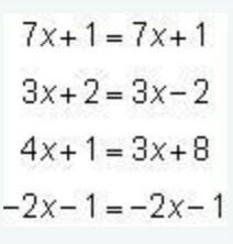 Let's just take a look at the second equation from this selection. We see that this equation looks almost exactly the same on both sides of the equation sign, EXCEPT that the constants are different ( I mean 2 and -2 ). IF we WERE to add/subtract two from both sides, they wouldn't cancel out but instead leave you with 4. If you had subtracted the 3xs, then you would have been left with 0. So, 0 does NOT equal 6, so therefore, this has no solutions.