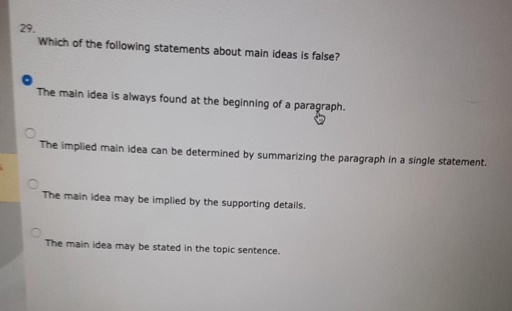 The main idea is always found at the beginning of a paragraph.