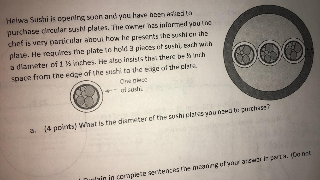 From the information, we know that the plate will hold 3 pieces of sushi, each with a diameter of 1 1/2 inches, and there be 1/2 inch space from the edge of the of the suchi to the edge of the plate.