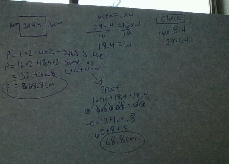then we divide 16 by both sides to make it even to get 18.4cm=W. Now we just plug everything in to the perimeter by doing 16 x 2 + 18.4 x 2 to get