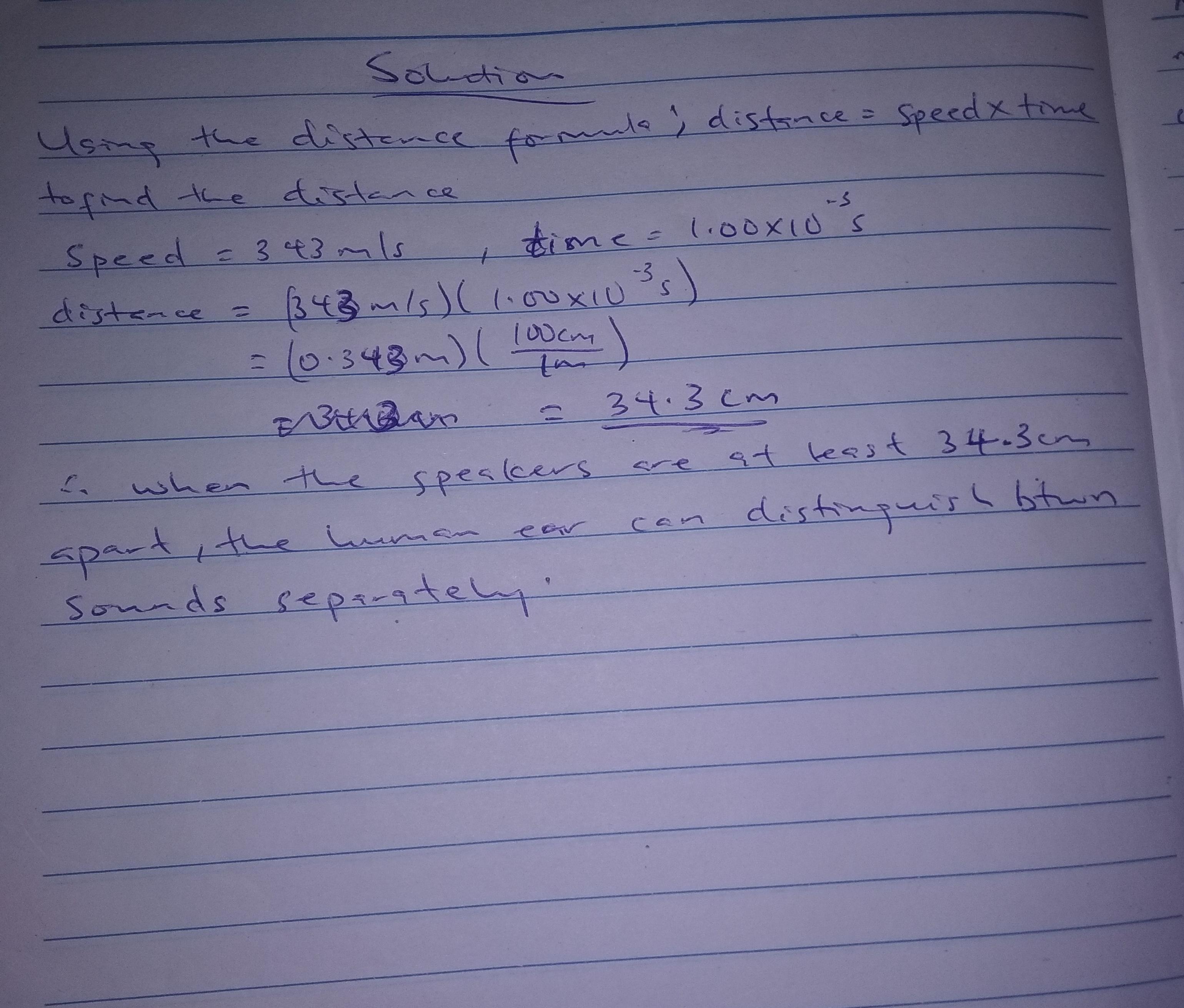 tween two speakers that produce sounds that arrive at noticeably different times on a day when the speed of sound is 343 m/s?