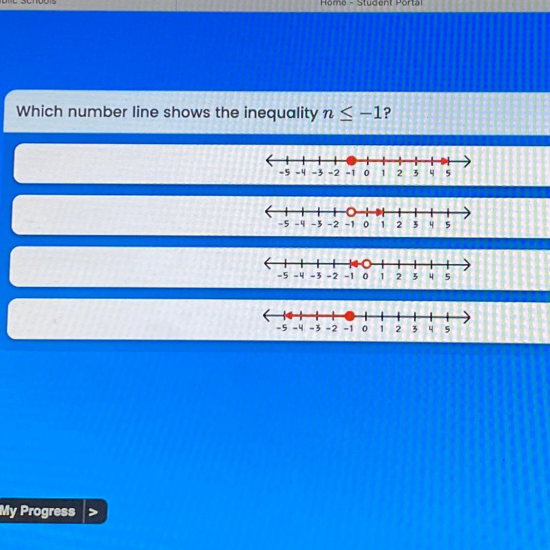 When you see "(variable) < " or "(variable) ≤ ", you should be looking for a line that extends to the left along the number line. The right end of the number line will be at the constant in this inequality. Here, the right end is -1. The circle is solid because the value -1 is included in the solution set.
