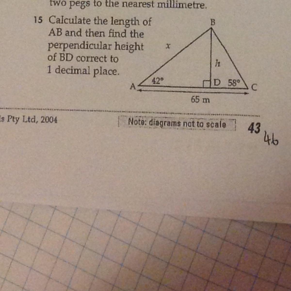 The three triangles (two smaller ones and one larger one, are all right triangles) Measure of angle A is 42 degrees. Measure of angle C is 58 degrees. AC is 65 m.