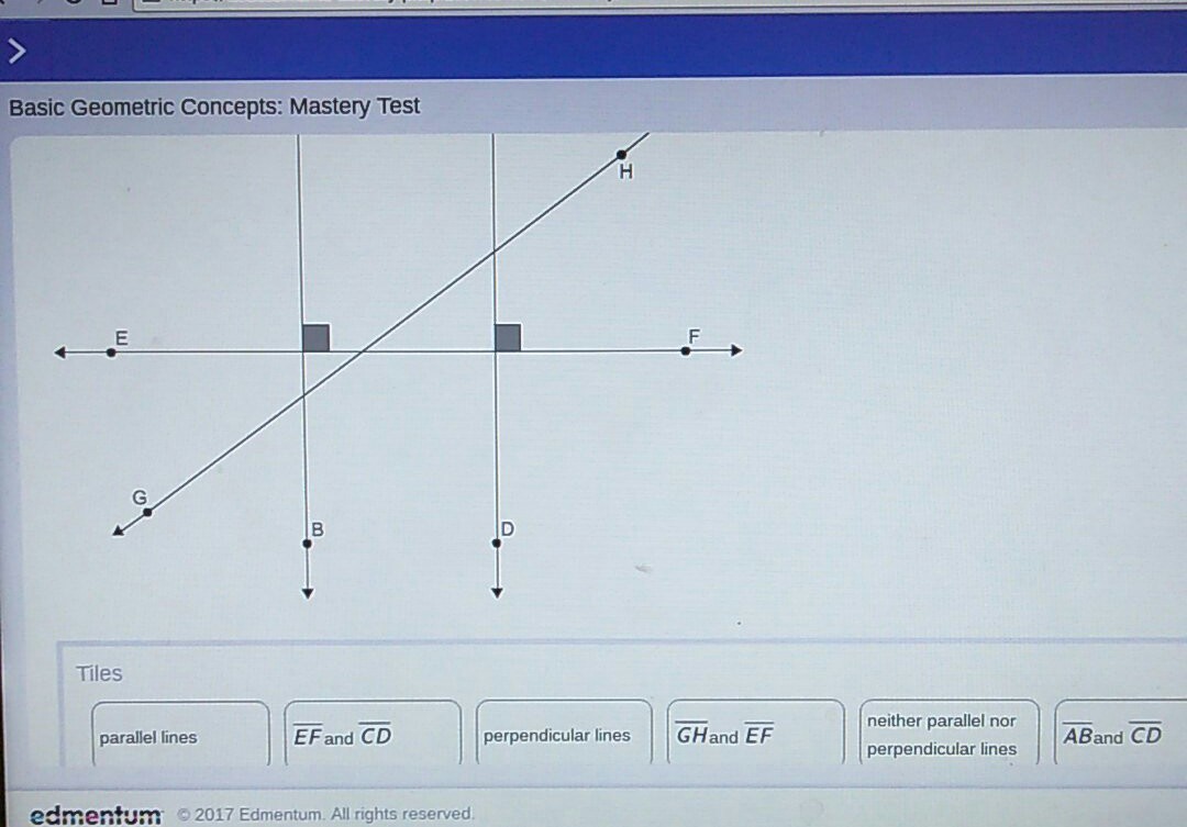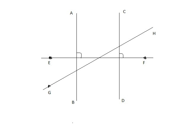 Parallel lines: AB and CD Perpendicular lines: EF and CD Neither parallel nor perpendicular: GH and EF