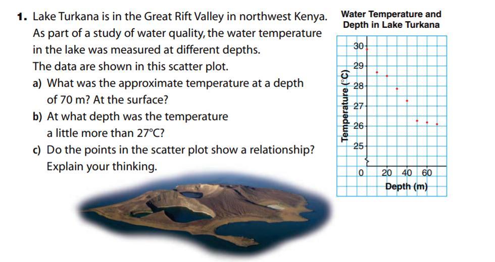 Yes, the scatter plot show a relationship between the depth and the temperature of Lake Turkana. It shows a negative correlation between the two variables. The deeper the lake is, the cooler the temperature .