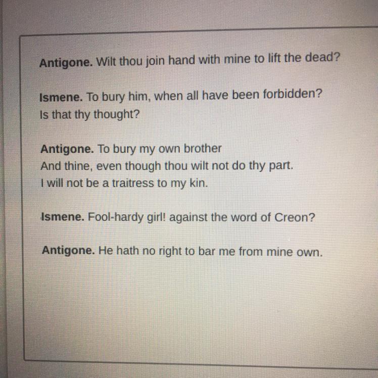 Judging from his dialogue, choose the reason Antigone has for her decision in this passage.