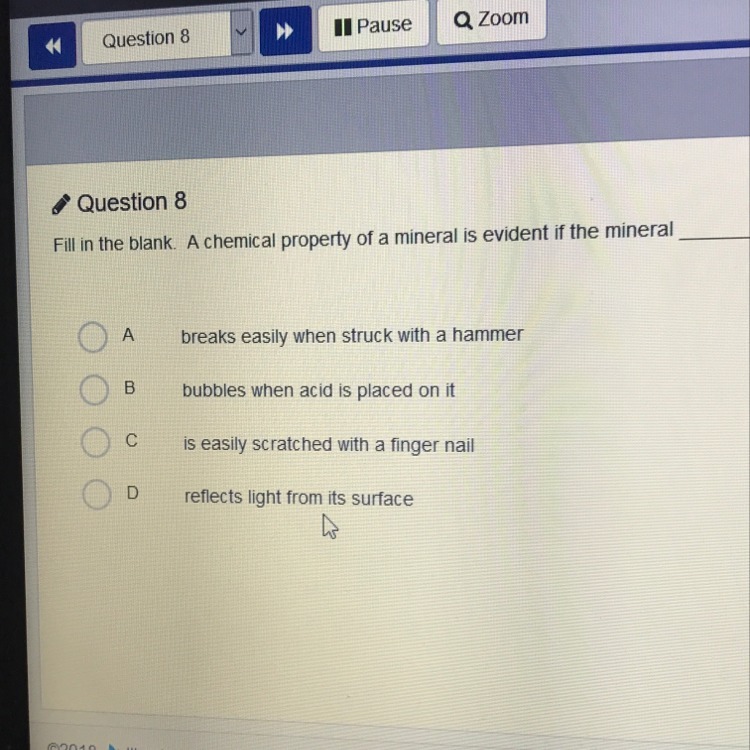 A chemical property of a mineral is evident if the mineral B, bubbles when acid is placed on it.
