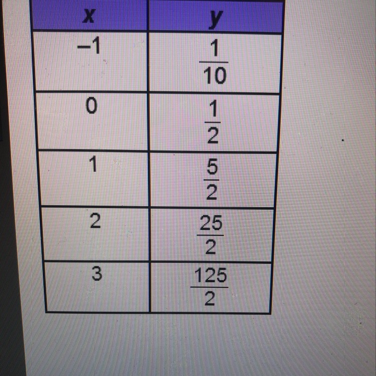 The y-values form a geometric sequence with a common ratio of 5 (answer choice b).