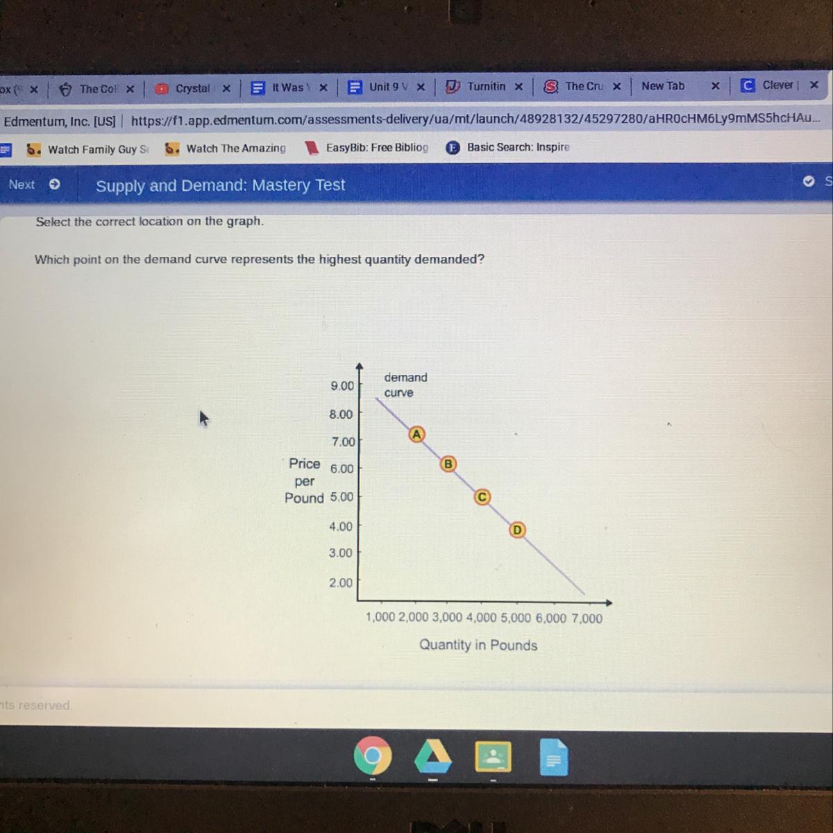 At point D there are 5,000 lbs of product being demanded at a price of $4.00. This graph shows the basic law of Supply and Demand. As the price gets higher the demand will decrease, which is demonstrated by the reduction in the pounds demanded as the price goes up.