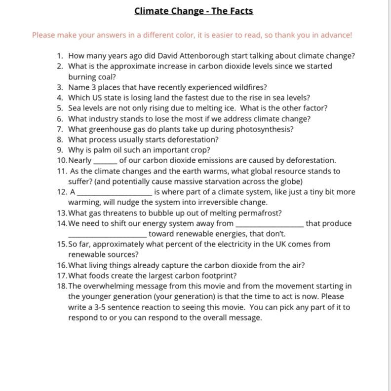 18. It wasn't really an eye-opener, necessarily, but it did make me more aware of the impacts of the burning of fossil fuels and other human activities. It also made me feel guilty, but I feel helpless at the same time.